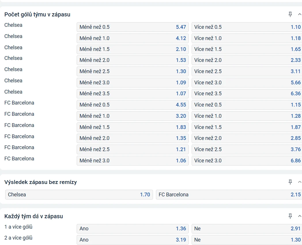 - Méně/více: Dá se aplikovat na góly, karty, rohy atd. Jde o počty během zápasu (u týmů zvlášť nebo dohromady).