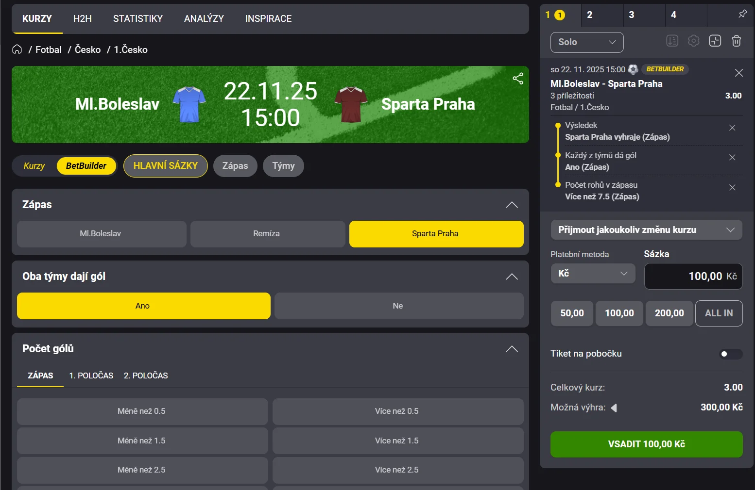 - Méně/více: Sázková společnost nastaví určitou hranici, třeba 2,5 gólu na zápas a vy tipujete, jestli padnou maximálně dvě branky (méně), nebo 3+ (více). Stejný systém se aplikuje třeba na rohy nebo na žluté karty.