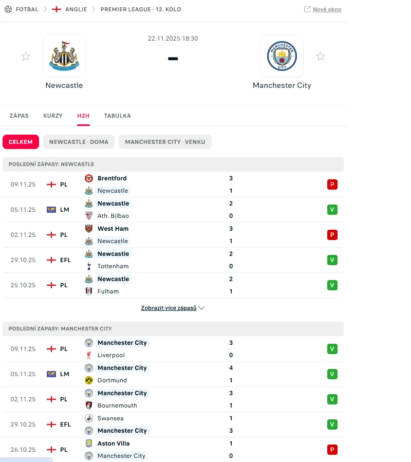 - Obecný přehled posledních pěti zápasů.
