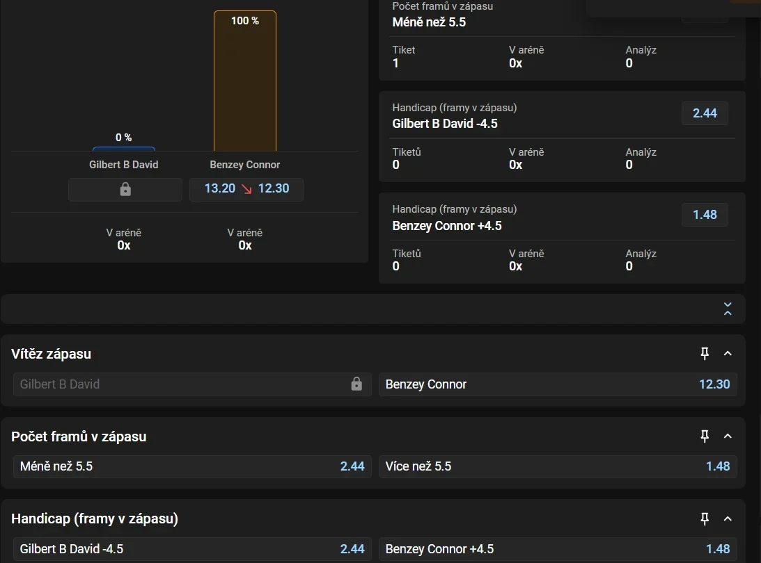 U předzápasových sázek to často bude vypadat tak, že favorit začíná s handicapem -1,5 framu a outsider má + 1,5 framu náskok. Na vás je, abyste určili, jestli favorit ztrátu smaže, nebo outsider svůj pomyslný náskok udrží.